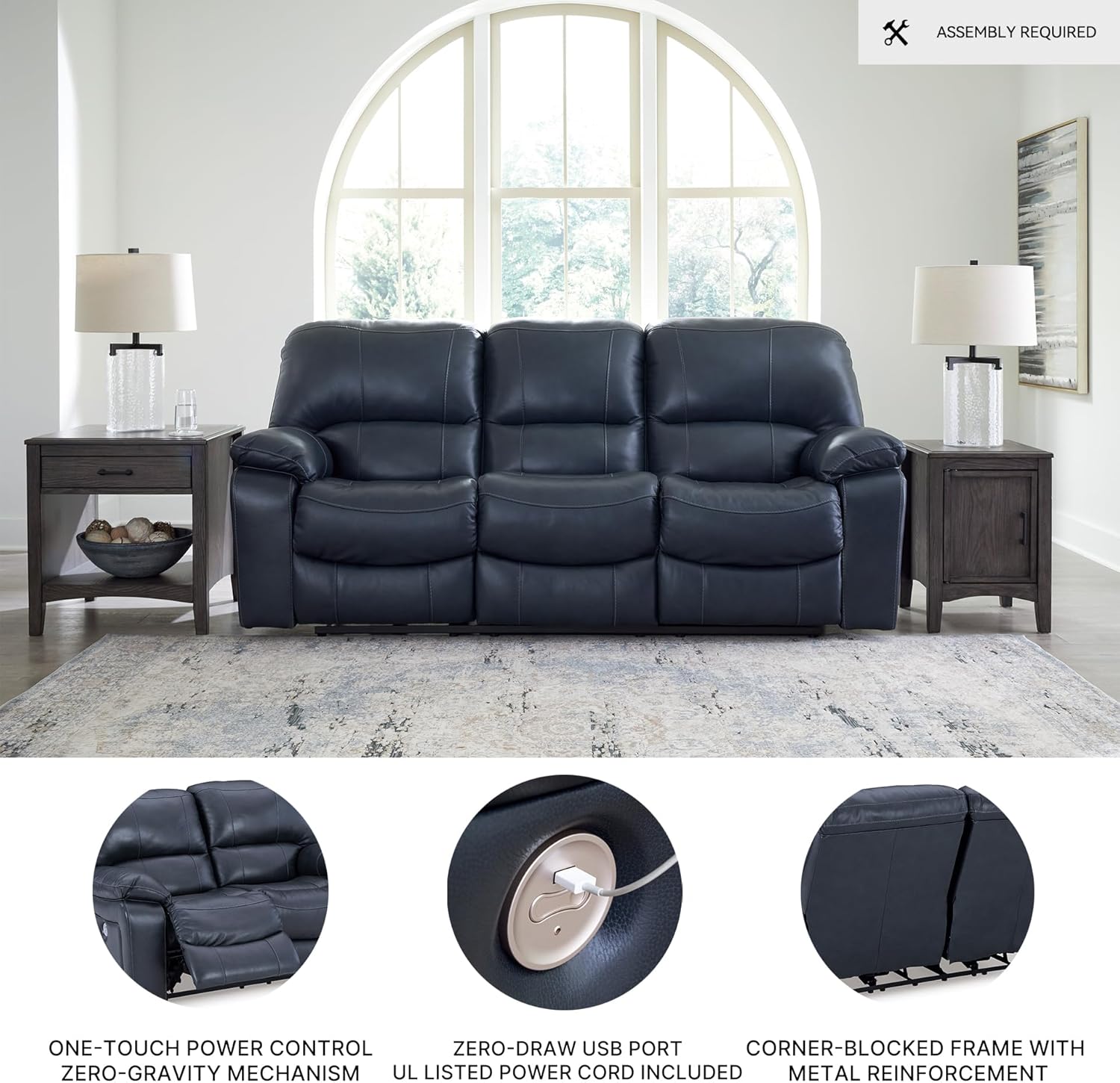 Focus on function and comfort with the Leesworth power reclining sofa, designed for busy family living rooms and relaxed entertaining spaces. This leather reclining sofa combines one-touch power reclining, a wall-hugger profile and a zero-draw USB port, so you can stretch out, charge devices and still fit a couch with recliner in smaller rooms or apartments. 100% top grain leather on the seating areas offers a soft, breathable feel, while skillfully matched faux leather on the sides and back keeps this recliner sofa looking luxe without breaking your budget. Ideal for movie nights, game days and everyday lounging, this 3 seat recliner couch coordinates easily with your existing tables, rugs and even a reclining sectional couch for a cohesive, contemporary setup.